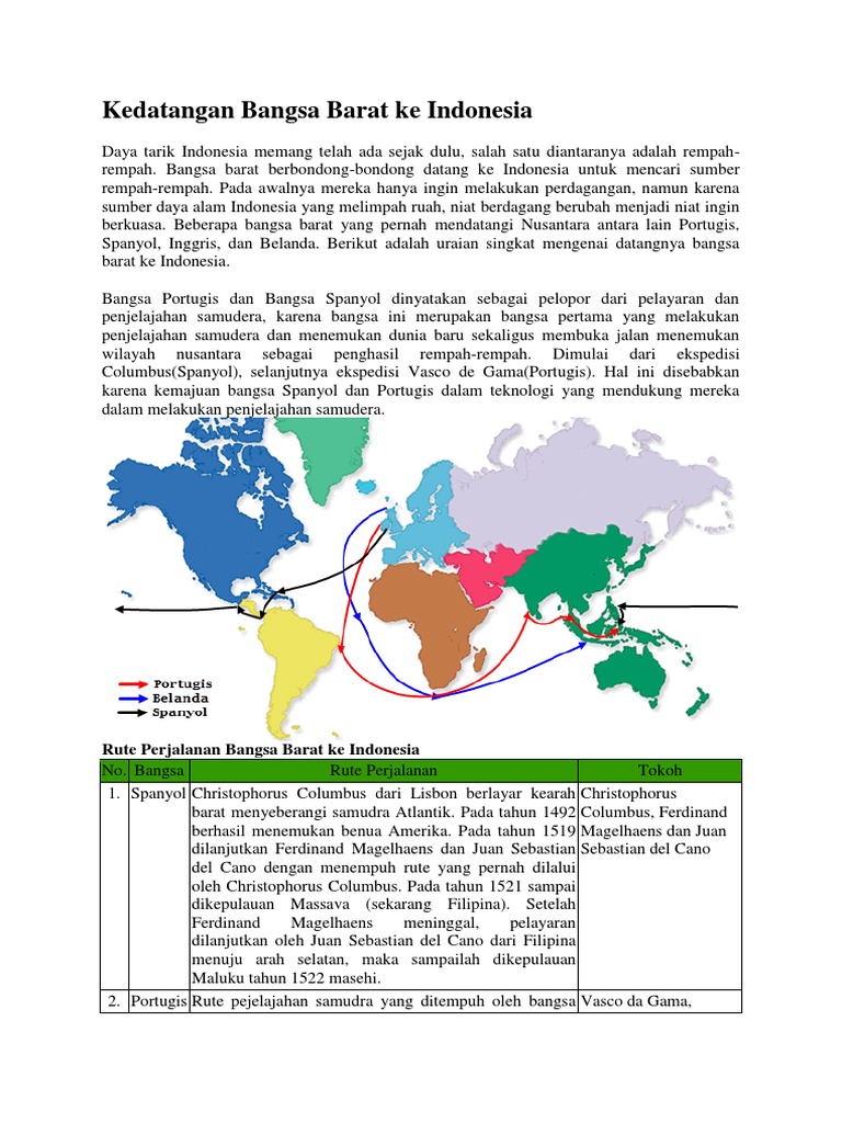 Rute pejelajahan samudra yang ditempuh oleh bangsa portugis dimulai dari kota lisabon (1486 dan 1497 ), menyusuri pantai barat afrika, semenanjung harapan, pantai timur afrika berlayar kearah. Sehingga bisa disimpulkan bahwa terbatasnya rempah sedangkan bangsa barat memerlukan rempah untuk memenuhi kebutuhannya seperti untuk pengawet makanan, bumbu. Latar belakang masuknya bangsa barat ke indonesia. Perang tersebut terjadi lebih dari dua abad sehingga membawa banyak perubahan, salah satunya. Faktor kedua yang mendorong kedatangan bangsa barat ke indonesia adalah untuk mencari kejayaan (glory). Perjalanan menjelajahi dunia oleh bartolomeuz diaz diawali tahun 1486. Rute perjalanan bangsa barat ke indonesia no bangsa. Kedatangan bangsa inggris ke indonesia. Portugis dan spanyol menjadi pelopor ekspedisi ke indonesia. Kronologi datangnya bangsa barat dimulai ketika terjadi perang salib di eropa. Bangsa spanyol pelopor bangsa spanyol yang mencari jalan langsung ke indonesia adalah christopher columbus, ia berjalan kearah barat. Datangnya bangsa barat ke indonesia tidak terjadi secara bersamaan. Ingin membuktikan bahwa bumi itu bulat.
